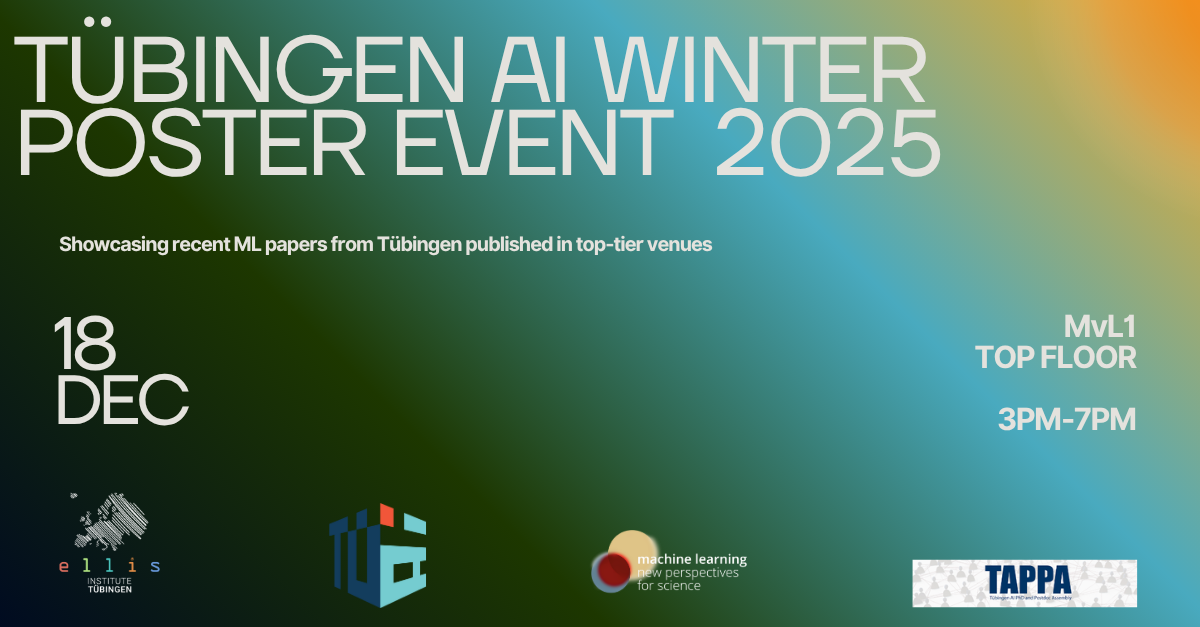 The ELLIS Institute Tübingen, the Tübingen AI Center, the Cluster of Excellence “Machine Learning: New Perspectives for Science”, and TAPPA (Tübingen AI PhD and Postdoc Assembly) are pleased to invite you to the Tübingen AI Winter Poster Event 2025.
